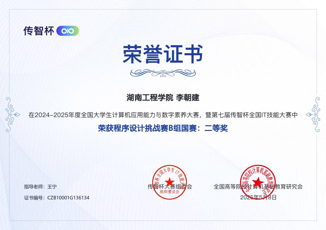 学科竞赛屡创佳绩。全年组织学生参与“蓝桥杯”全国软件和信息技术专业人才大赛(3项国奖)、“全国大学生信息通信技术大赛” (1项国奖)、“传智杯”全国IT技能大赛(2项国奖)、中兴捧月“星匠师”巧匠精英挑战赛(1项国奖)、睿抗机器人开发大赛(2项国奖)、中国机器人及人工智能大赛(1项国奖)、全国大学生集成电路创新创业大赛、全国大学生信息安全竞赛、全国大学生软件创新大赛等各类高水平竞赛中,斩获国家级奖项10个,省级奖项115个。湖南省“物联网应用创新设计竞赛、湖南省大学生计算机程序设计应用开发竞赛、湖南省大学生智能导航科技创新大赛、网络安全精英挑战赛等赛事中获得省级一等奖7个,二等奖7个,三等奖10个。