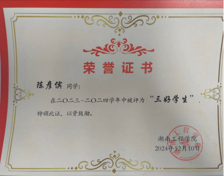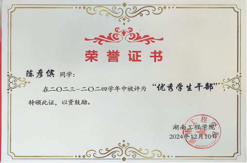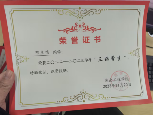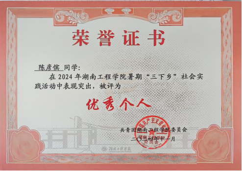 在志愿服务方面,陈彦傧同学累计志愿服务时长近300小时,参与30余项志愿活动,荣获省市校级“优秀志愿者”称号。作为湘乡市“情满旅途·暖冬行动”的志愿者,他多次参与春运志愿服务,协助旅客,特别是在寒冬时节,他顶风冒雪为老弱病残旅客提供帮助,并主动搀扶年迈旅客上车,获得湘乡市“情满旅途·暖冬行动”优秀志愿者称号。