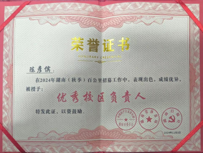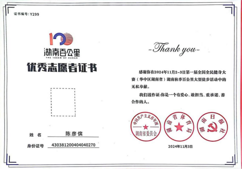 此外,他还担任湖南春秋季百公里活动校区负责人,组织志愿者团队,确保赛事顺利进行,荣获湖南省“百公里优秀志愿者”称号。在无偿献血宣传活动中,他在突发事件中表现冷静,及时救助晕倒的志愿者,荣获湘乡市“无偿献血·传递关爱”优秀宣传大使荣誉。